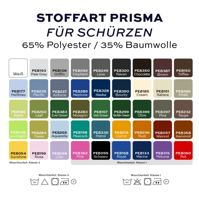 Aus 65%Polyester / 35%Baumwolle, 215 g/qm, auf 95°C waschbar.