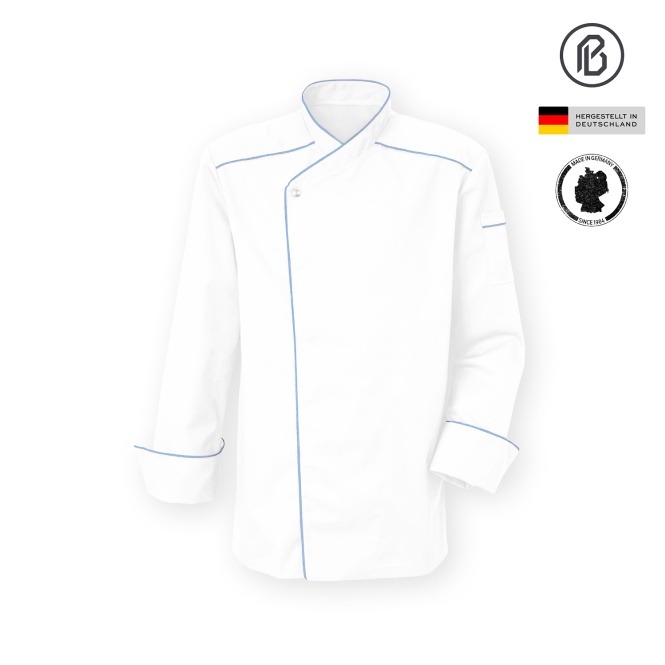 Die Kochjacke MAGNA hat einen gradlinigen Schnitt, mit einem Kragen der diagonal zum obersten, sichtbaren Druckknopf geführt wird. Die restlichen Druckknöpfe sind verdeckt und verjüngen sich trapezförmig nach unten. Die Linienführung dieser Kochjacke wird durch eine farbige Paspelierung unterstrichen, die, wie auch die Kugelschreibertasche, zur Grundausstattung dieses Modells gehört. Zusätzlicher 'Eyecatcher' ist der Paspelstreifen, der parallel zur Schulternaht, sowie an der Kugelschreibertasche verläuft.